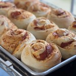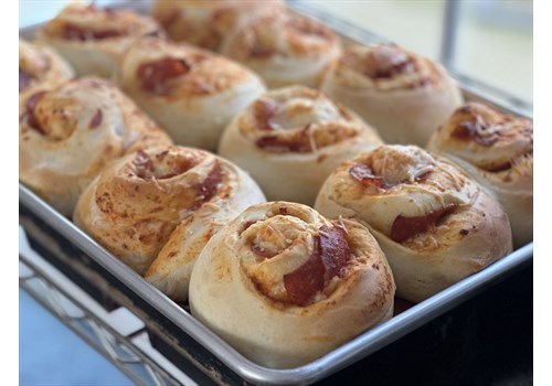 Pepperoni, Mozzarella and pizza sauce swirled into a bun.