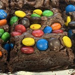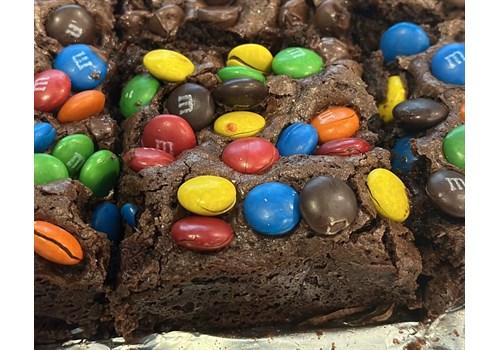 Our fudge brownies made with Gluten Free flour topped with M&M